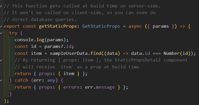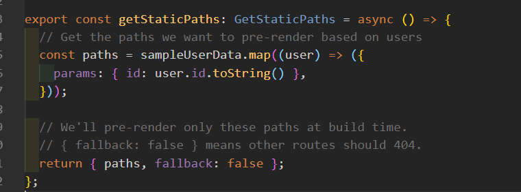 pages/users/[id].tsx에서 다음과 같은 함수를 발견했고, 아마 데이터를 가져오는데 있어서 build time에 가져오도록 하는 그런 함수인듯 싶어서 찾아봤다.