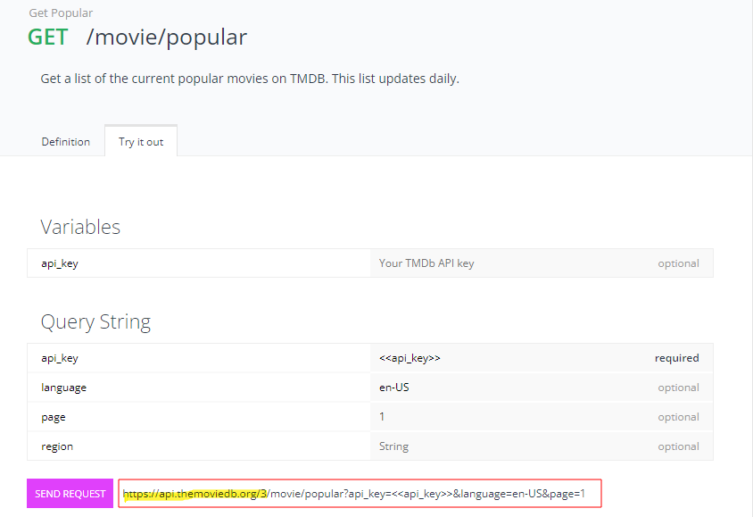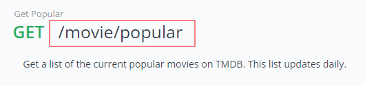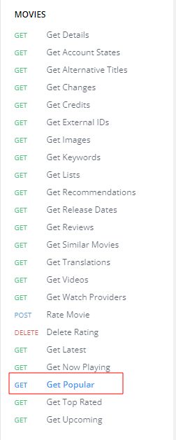 왼쪽 사이드바에 movie, trending등 다양한 카테고리가 존재하는걸 볼 수 있다. 우리는 movies를 클릭하고 get popular를 클릭한다.